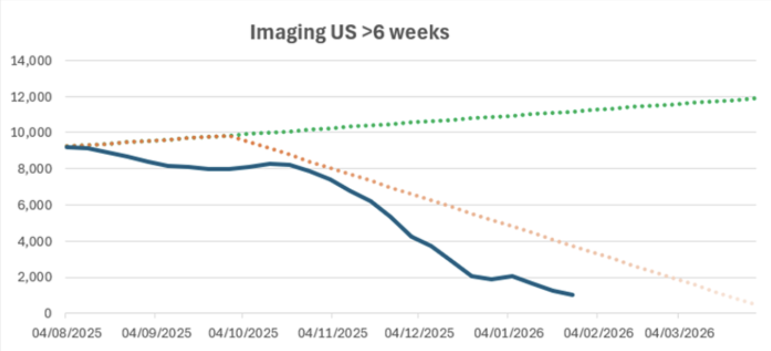 When we began working with Glasgow’s imaging service, over 9,000 patients were waiting more than 6 weeks for a scan and the projected trajectory (green line) showed the backlog continuing to rise toward 12,000. Even under expected recovery plans (orange line), thousands of patients would still have been waiting well into 2026. What actually happened is shown in blue. By deploying additional capacity, optimising pathways, and working in close partnership with local teams, we scanned 8,000 patients and fundamentally changed the direction of travel.